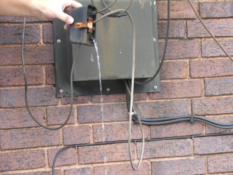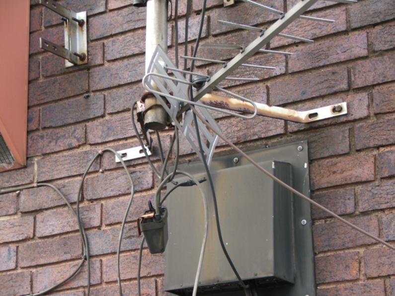 On top of a rather high office building in Hammersmith we found this beauty. Whoever installed it wasn't too worried about doing a good job because they bodged the reflectors and taped the wires together. They didn't seem to worry about longevity either because they left the masthead amp hanging upside down on the coaxial cables. When we turned it over we found it was full of water. What a disaster. |