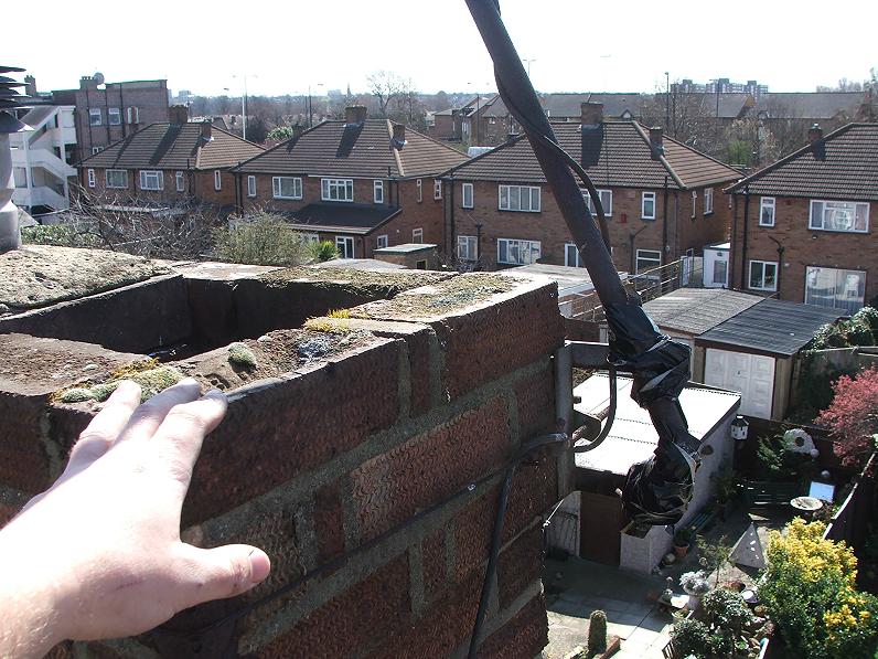 This old mast and lashing kit has given 25 or so years of service. Over this time the mast has been rotting through and finally it has given way. Rather than replace the lot properly, someone has decided to try bodging it with some gaffa tape. Unsurprisingly this hasn't lasted long but I wonder how much they charged for this "repair"? Also once again the bracket is fixed to the top three courses when it would be just as easy to fit it lower down. |